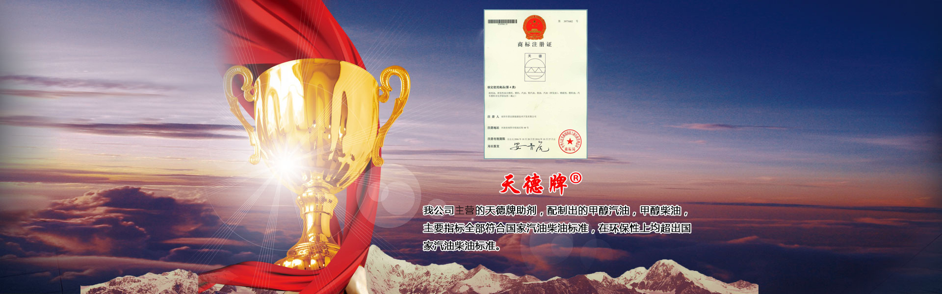 本公司主要產品有甲醇汽油添加劑、甲醇柴油添加劑、車用復合柴油添加劑、甲醇燃料油添加劑以及雙燃料控制器和油罐除水劑六大系列九種產品,具有廣闊的市場空間和經濟效益。其中添加劑系列已在國家商標局注冊為“天德牌”,天德牌問世二十多年來,在保證產品質量的同時,給廣大客戶帶來了可觀的經濟利益,得到廣大油品行業用戶的一致好評…… 了解更多+